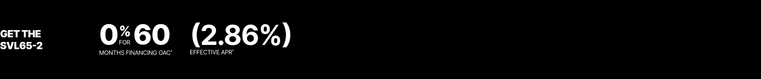 Representative finance example for the SVL65-2: $95,275.17 financed at 0% (2.86% effective APR which factors in $5,945.17 in non stackable cash that cannot be combined with finance offers) equals $1429.13 monthly for 60 months. $9,527.52 down payment required. Cost of borrowing is $5,945.17 for a total obligation of $95,275.17. Financing available on approved credit. Prices and payments include freight and other applicable fees (including environmental fees, administration fees, set-up fees, and dealer fees on the model specified). 0% for 60 months available only on SVL65-2 models Offer valid until 03-31-2026.
